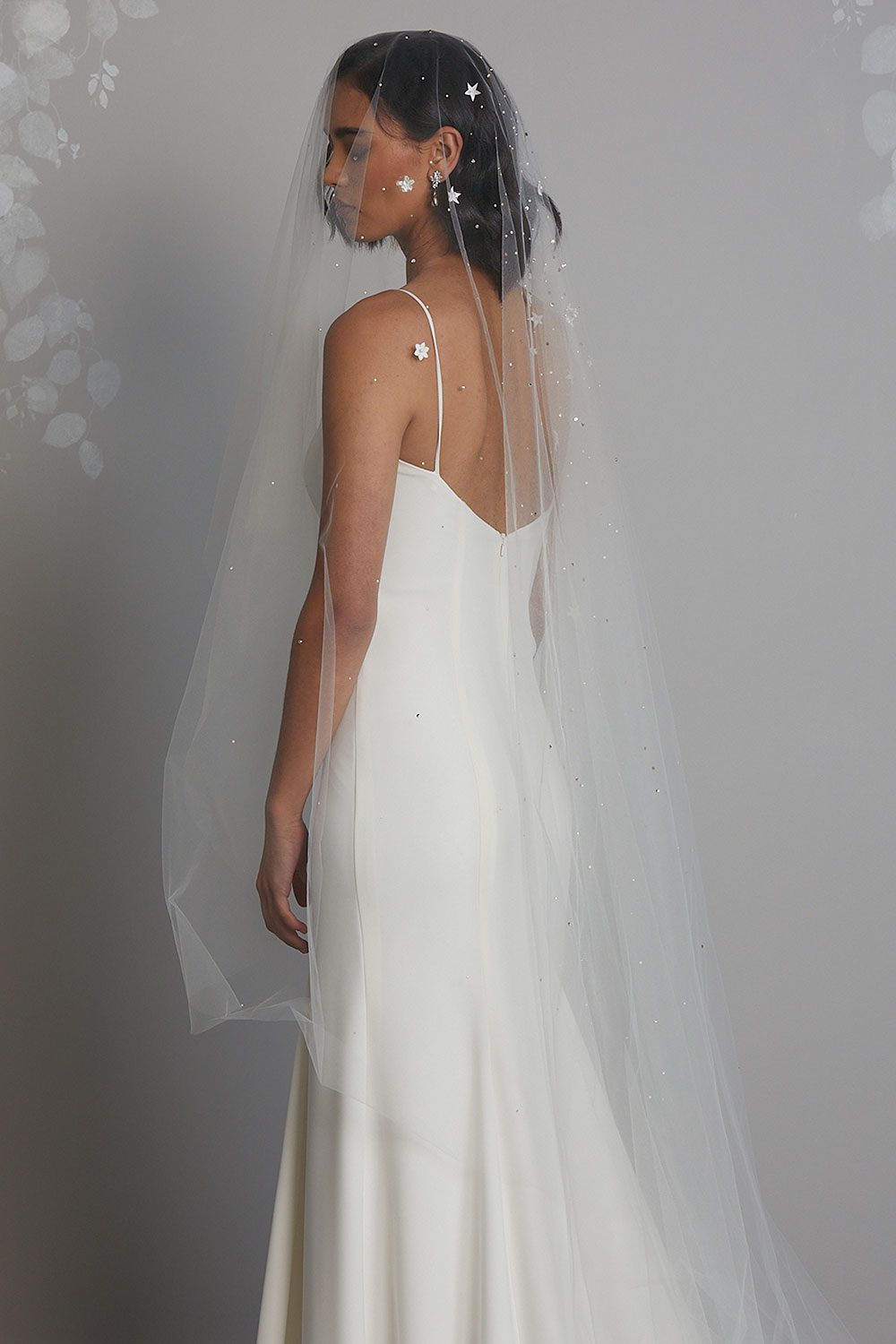 Celestial and captivating, the Verona veil is designed for the bride who dreams of making a dramatic entrance. This ethereal, face-covering veil features an enchanting constellation of hand-beaded stars, dazzling Swarovski crystals, and lustrous pearls delicately scattered across luxuriously soft tulle.