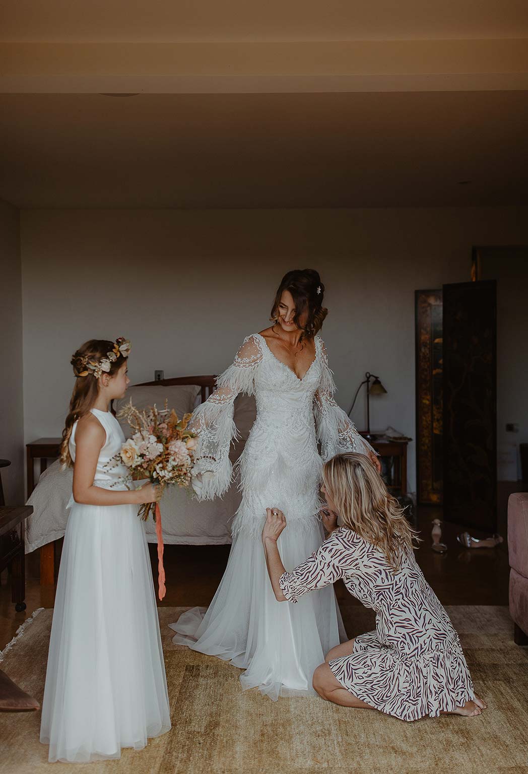 Sarita fell in love with our gorgeous Chanel gown from our Heart of Havana Collection. She loved the cheekiness of a shorter gown and also wanted a really cool party dress. For the formal ceremony however, she thought she should have a full-length gown – we suggested the idea of having a separate underskirt to slip underneath her gown which featured a split made in the same tulle and silk as the original. Sarita wowed both her guests and Nigel by removing her underskirt after the ceremony and revealing her gorgeous legs!