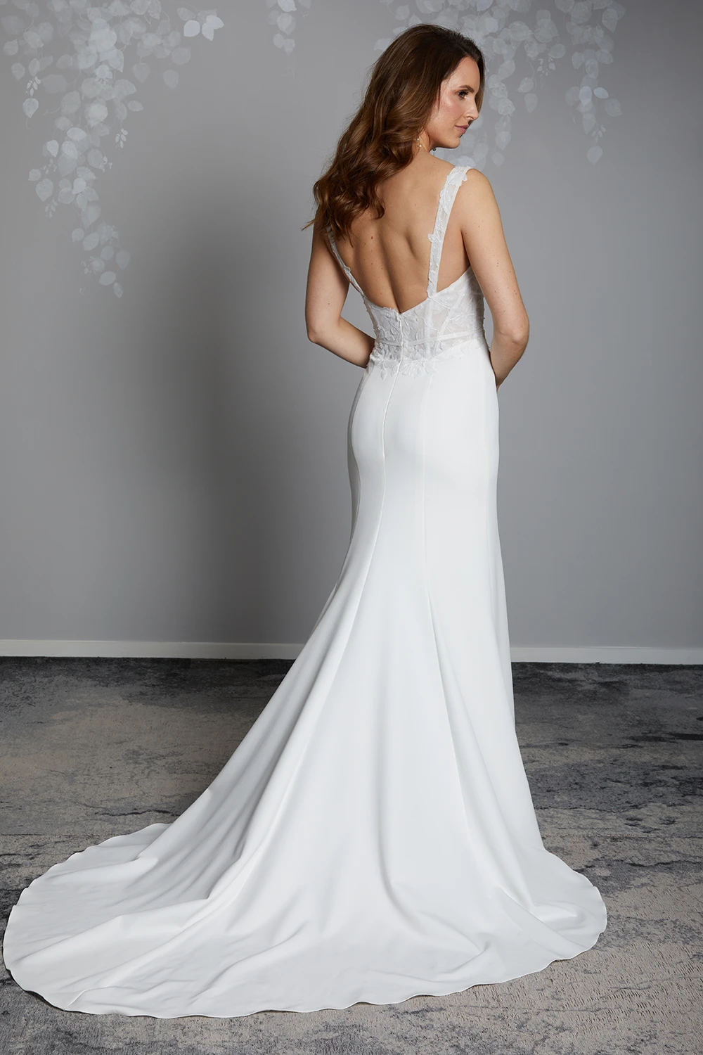 From the waist, the design melts into a luxuriously draped fit-and-flare skirt, cut in a fluid bridal crepe that skims the hips before flowing effortlessly into a subtle, sweeping train.